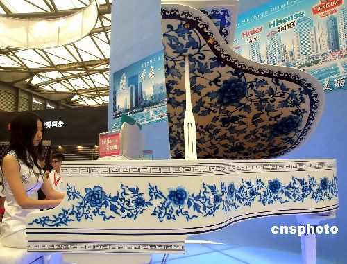 10月9日,身穿旗袍的美女在上海乐器展中弹奏钢琴。琴身上描绘着中国传统青花瓷纹饰,透出浓郁的古典韵味。 中新社发 井韦 摄