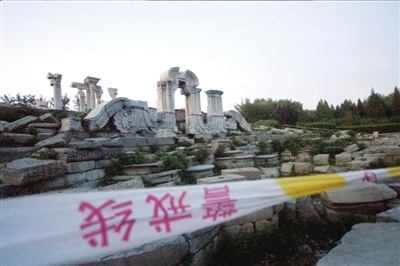 2008年10月12日,北京圆明园大水法由于长时间遭到不文明游客破坏,已经设立隔离带,禁止游人攀爬遗址。