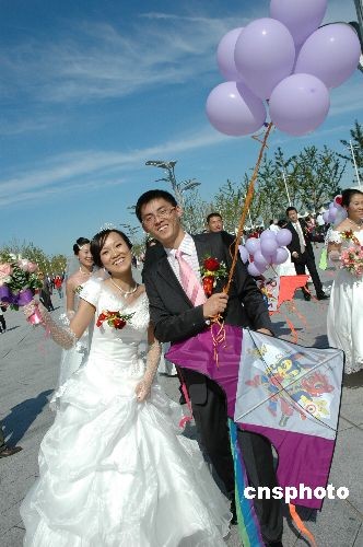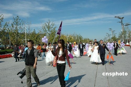 2008年10月11日,北京奥林匹克公园迎来向社会免费开放后的首批新人。当日,来自北京的10对新人巡游北京奥林匹克公园,并在“鸟巢”前举办了集体婚礼。从10月10日开始,北京奥林匹克公园正式对外免费开放,国家体育场“鸟巢”和国家游泳中心“水立方”成为继天安门、故宫、长城等著名景点后又一旅游热点。中新社发 梁宝海 摄