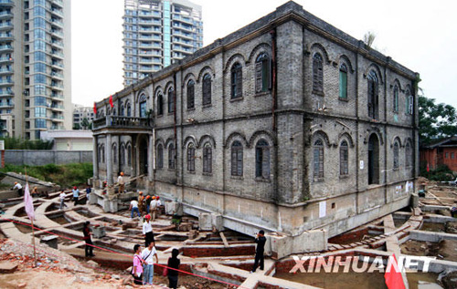 近日,福州泛船浦教堂神父楼的整体旋转工程进入尾声,90度“转身”即将完成。神父楼完成旋转后,还将向南移动,为城市道路建设“让路”。