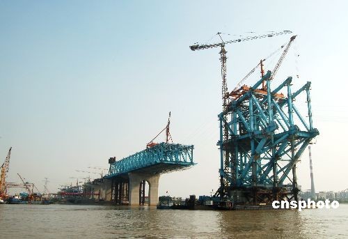 10月13日,江苏南京,中铁大桥局的建设者们正在京沪高速铁路南京大胜关特大跨江大桥上对桥面钢梁进行架设。南京大胜关大桥是京沪高速铁路最大的一座跨江大桥,自2006年7月开工建设以来,主桥的5号、6号桥墩,9号和10号桥墩均以完成钢梁的架设,南北引桥分段开始对简支梁和连续梁的混凝土浇注,3300人不分昼夜奋战在大桥建设第一线,预计到2009年11月30日前可完成全部桥梁的架设。中新社发 丰成 摄