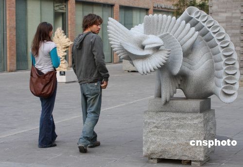 10月14日,不少游客在今日美术馆欣赏数码石雕。近日,以“科技与艺术的完美交融”为主题的数码石雕全国巡展在北京今日美术馆拉开帷幕。这些作品首先由美国艺术家使用三维数字设计解决方案,在电脑虚拟的环境中进行设计、分析、模拟和建模。而后,中国的雕刻师们参照三维快速成形打印设备制作的物理模型,以手工雕刻完成。中新社发 吴芒子 摄