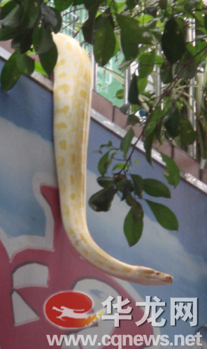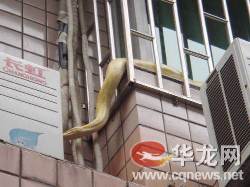 15日下午14时30分左右,潜居20多年的宠物蟒蛇,趁主人不在家,跑到一居民楼的阳台上“晒太阳”,这只金黄巨蟒在重庆市江津区天香街引起了一阵骚动。