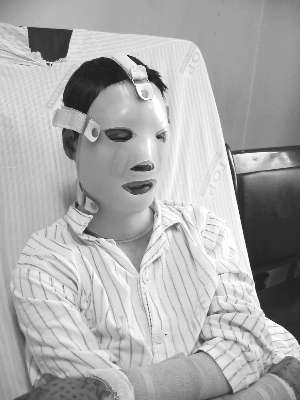 半年前,李刚在工作时,面部被乙炔气体大面积烧伤,双手也残疾了。性格开朗的他变得自闭起来。目前,李刚正在东南大学附属中大医院康复科,戴着一种特殊的面具进行压疤治疗,现在面部疤痕少了很多,也渐渐走出了心理阴影。而采用这种特殊方法对烧伤患者进行治疗,在南京是第一例。