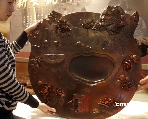 10月15日,一方取名为“盛世颂”的巨型澄泥砚台在河南洛阳制作完毕亮相。据悉,这是为纪念中国改革开放30年,中国工艺大师李中献及其弟子李湛历时近一年倾心制作的。中新社发 张晓理 摄
