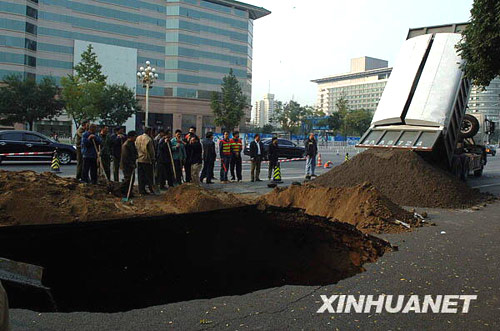 10月17日,施工人员在对塌陷路面进行抢修。