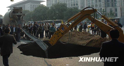 图:北京西长安街发生路面塌陷