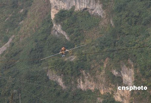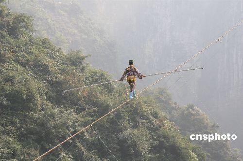 18日,“高空王子”阿迪力的亲侄子赛买提·艾江在张家界天门山的万仞绝壁之间展示了“达瓦孜”的惊人绝技。虽然赛买提在最后50米处意外“失手”,被救援人员接回终点,但在倾斜达39度的钢绳上行走了650米,已经成功挑战了世界最大斜度的高空走钢丝极限。“达瓦孜”意思是“高空走绳索”,是新疆维吾尔族历史悠久的民间传统绝技。中新社发 邓霞 摄