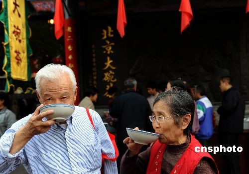 10月20日,路人在北京前门老舍茶馆前购买两分钱一碗的大碗茶畅饮解渴。当日,文化部授予老舍茶馆“国家文化产业示范基地”在店内揭牌。1979年,当时宣武区大栅栏街道办事处干部尹盛喜为了解决街道待业知青的就业问题,利用改革开放后的市场机制,带领几名待业知青在前门箭楼脚下支起茶摊,靠卖每碗二分钱的“大碗茶”而发展起来,1988年先后创建北京大碗茶商贸公司和改革开放后京城第一家京味茶馆——老舍茶馆。中新社发 廖攀 摄