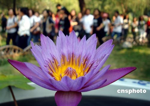 10月21日,游人在江苏苏州拙政园观赏反季绽放的睡莲。近日,苏州拙政园中的数株睡莲竟“花开二度”,反季节地绽放出了美丽的花朵。据园艺专家介绍,此种现象与今秋苏州气温持续偏高有关。在金秋时节能观赏到盛夏的莲花,别有一番韵味,众多中外游人前来观赏。 中新社发 王建康 摄