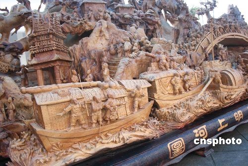 10月21日,长18米的巨型根雕《清明上河图》在开封东京艺术中心广场展出。据工作人员介绍,这一作品原木是一株生长在东南亚热带崇山峻岭中的香樟古木,树龄在2300年以上,树高百米,树干直径4米,根径20米,完全暴露风干近10年。后以北宋画家张择端的《清明上河图》为蓝本,由福建35位艺术家和工匠历时5年精雕细刻而成。雕刻完成后,作品长18米,高2.56米,宽2米,重12吨。 据悉,这一来自福建莆田的巨型香樟木根雕《清明上河图》作品,已经申报吉尼斯世界纪录。中新社发 刘书亭 摄