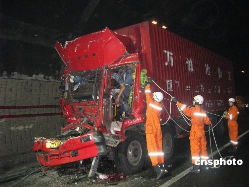 10月23日早上7时左右,浙江甬台温高速温州往福建方向瑞安三都岭隧道内发生一起恶性交通事故,两辆集装箱货车发生严重追尾事故,造成福建籍牌照集装箱车上两名男子当场死亡。事故发生后高速交警、消防、路政等相关部门第一时间赶往现场实施救援。中新社发 王旻 摄