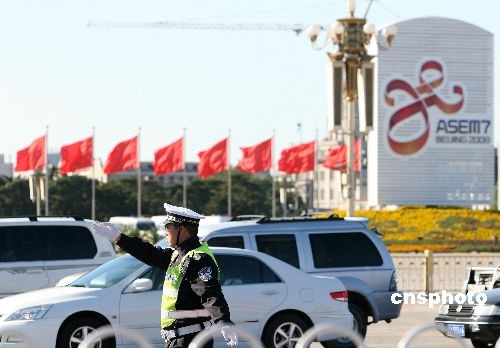 2008年10月23日,交警在北京天安门广场为第七届亚欧首脑会议代表抵京执勤。据悉,24日至25日,第七届亚欧首脑会议在北京举行。为确保亚欧首脑会议顺利进行,保证交通安全畅通,北京市公安局近日发布通告,会议期间,将对部分地区及道路分时、分段采取临时交通管制措施。中新社发 鲁谷 摄