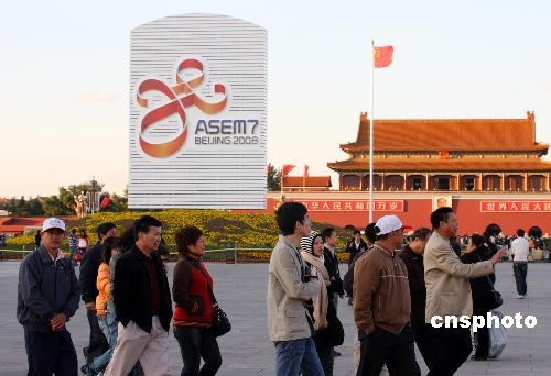 10月23日,北京天安门广场一派祥和,以亚欧首脑会议为主题的花坛光彩夺目,第七届亚欧首脑会议将于10月24日至25日在京举行,这是继2008奥运会后北京举办的一次重要的国际性盛会。中新社发 吴芒子 摄