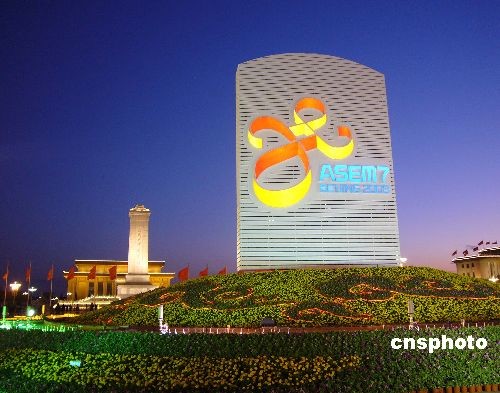 2008年10月23日傍晚,北京天安门广场灯火通明,夜色璀璨。第七届亚欧首脑会议标识在五色灯光照射下,更加醒目美丽。中新社发 玉龙 摄