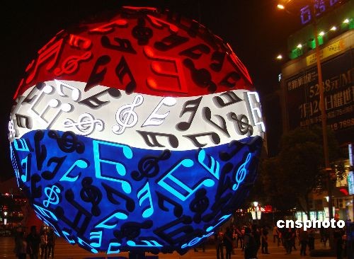 2008年10月24日晚,游客在欣赏苏州石路步行街广场上灯光变幻的巨型音符球。近日,苏州石路步行街广场上一只直径达3米的巨型音符球亮灯。中新社发 王建康 摄