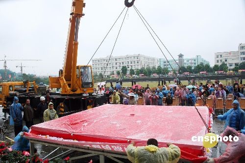 10月26日下午,四川省南溪县豆腐干食品文化节现场,一块长4.21米、宽4.2米、高9.5厘米左右,重达1.8吨左右的巨型豆腐干特别引人注目,它将于26日晚间揭开红盖头,申报世界吉尼斯纪录。 南溪豆腐干制作工艺因技术独特、工艺的传承人缺乏等原因,已被列入四川省首批非物质文化遗产目录。这次试制的巨型豆腐干全部按照豆腐干传统工艺制作。数十名技术骨干和工人经30多个小时的辛勤劳作,共使用了黄豆1300余公斤。中新社发 陈涌 摄