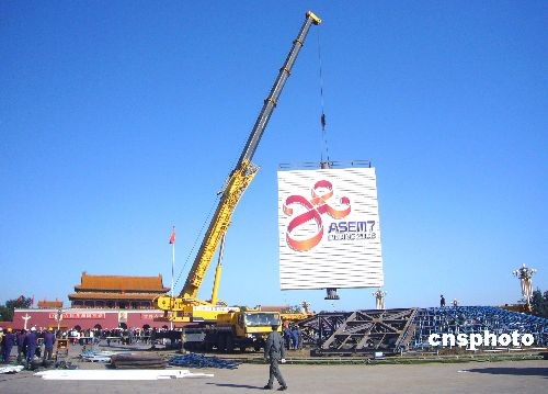 2008年10月27日上午,北京天安门广场,施工人员开始吊卸第七届亚欧首脑会议标识,整个中心花坛的拆除工作正在加紧进行,预计将于今晚全部拆卸完毕。今年的天安门广场花坛布置从7月5日开始施工,经历奥运会、残奥会、国庆、第七届亚欧首脑会四个时期,至今已历时3个多月。这是自1986年广场摆花以来,史无前例的。中新社发 玉龙 摄