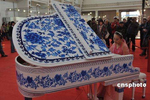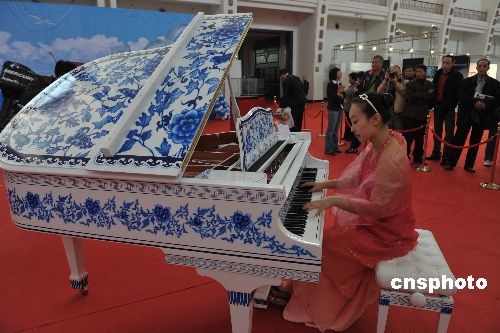10月28日,在中国东北亚(沈阳)进口商品博览会上,一名少女在弹奏青花瓷钢琴。现场的工作人员介绍说,这架名为琴瓷的钢琴是专门为前不久举办的国际乐器展览会制作的,琴身上的瓷纹是由技术人员手工雕刻而成,目前在世界上仅有这一架,市场售价在46.9万元左右。中新社发 徐建国 摄