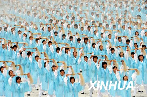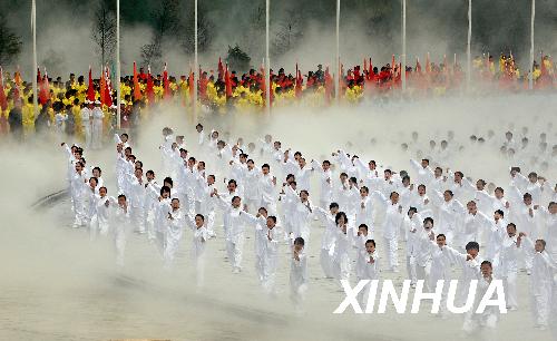 10月30日,太极拳爱好者在表演太极拳。当日,第三届世界传统武术节系列活动之一——“走进武当”万人舞太极在武当山风景区举行。来自美国、英国、俄罗斯、澳大利亚和中国等69个国家和地区的近2000名武术爱好者,共同欣赏了这一大型武术表演。新华社记者余国庆摄