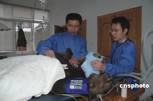 10月29日凌晨5点多,一只来自唐家河保护区的野生大熊猫因病进入了当地人的生活区域求救,被当地保护区管理处的工作人员送到中国保护大熊猫研究中心雅安碧峰峡基地兽医院救治。继10月26日卧龙救治一只野生大熊猫后,这是地震以后受灾地区发现的第二只野生大熊猫。图为工作人员在救治大熊猫。中新社发 罗小韵 摄