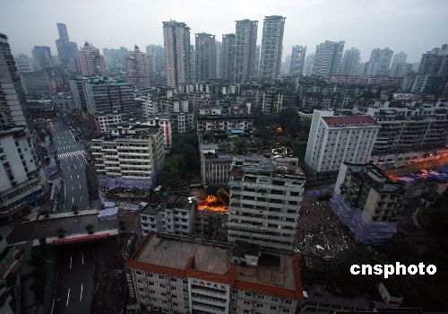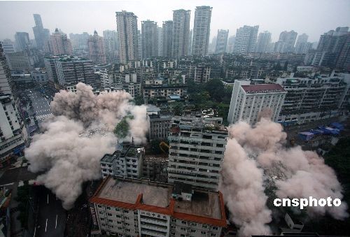 2008年11月1日早晨7时,重庆市江北区成功的对该区塔坪路的4栋旧楼房进行了定向爆破,这是2008年重庆市主城区危旧房改造的“第一爆”。本次实施爆破拆迁的4栋楼房,修建于上世纪80年代末,属于江北区观音桥商圈塔坪路改扩建项目,该项目涉及8栋楼房近3.5万平方米房屋,此次爆破拆除的塔坪41号、42号、85号和86号4栋楼房,总建筑面积约1.5万平方米。据了解,塔坪路危旧房爆破拆除以后,将在该区域实施塔坪路改扩建工程。届时,观音桥商圈东北片区将形成“塔坪路——枫香庭道路——洋河大道——建北一支路北段”的循环道,并与现有的观音桥商圈环道相连,形成“环环相扣”的交通疏导模式。整个工程将于2009年春节前完工。中新社发 贺终荣 摄