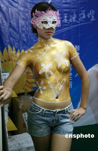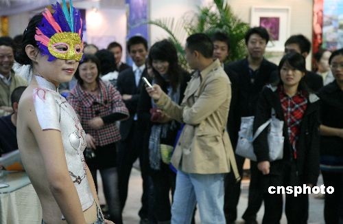 11月2日,为期四天的2008秋季南京家装文化节在南京城市规划展览馆开幕。一家企业为宣传其涂料的环保品质,特意用涂料在模特身上绘制人体彩绘,吸引消费者。中新社发 钟山 摄