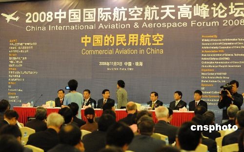 十一月三日,珠海航展开幕前夕,由中国工业和信息化部、中国商飞公司、中国航空工业集团公司共同主办的二零零八中国国际航空航天高峰论坛在珠海举行,论坛分“中国民用航空发展线路图”、“通用航空与区域航空的发展”两个单元,中外航空航天界近三百名精英人士相聚一堂,共商未来发展大计。中新社发 孙自法 摄
