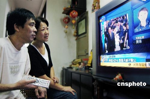 11月3日,侨乡泉州市民在电视机前收看陈云林会长抵达台湾桃园机场的实况转播。今日,海峡两岸关系协会会长陈云林率海协会协商代表团,展开在台湾的历史性访问行程。中新社发 傅丹丹 摄