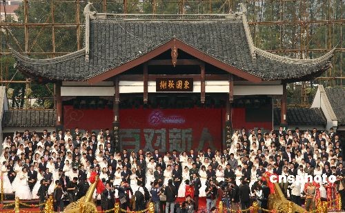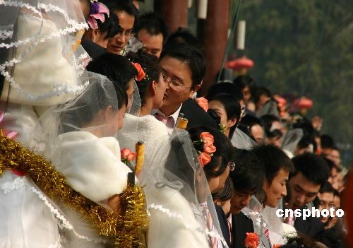 2008年11月5日,金陵百对新人婚典在南京白鹭洲公园举行,108对新人共同度过人生重要时刻。中新社发 阿董 摄