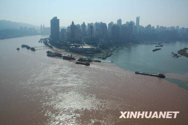 11月8日,受长江上游持续降雨和三峡工程实验性高位蓄水影响,重庆朝天门港的嘉陵江、长江交汇处江水呈现一清一浑,泾渭分明。据了解,往年入冬时节长江、嘉陵江已进入枯水期,今年随着三峡水库蓄水,长江水位迅速上升,当日18时,重庆寸滩长江水位达到175.32米。 新华社发(周会 摄)