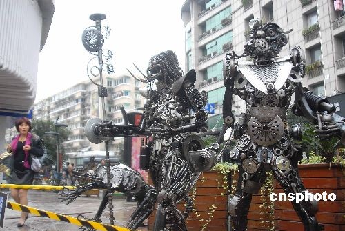 2008年11月8日,钢铁侠、怪兽、恐龙、大蟒蛇等9个“铁家伙”集体出现在杭州街头。它们由艺术家周峰用废弃的零配件制成,参加以“我·机器人、创意在武林、创意成就品质生活”为主题的“西湖创意市集”武林路站活动。 中新社发 引炜 摄