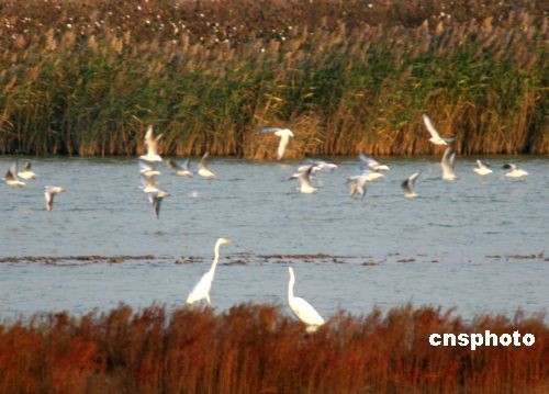 11月9日,一群候鸟在连云港临洪湿地上盘旋、觅食。随着生态环境的日益改善,江苏连云港成为多种候鸟理想的越冬之地,来此越冬的候鸟逐年增多。目前,面积达116平方公里的临洪湿地保护工作已经启动,连云港市将把临洪河口湿地打造成集滨海湿地、城市湿地、农耕湿地、文化湿地于一身的城市中央湿地公园。中新社发 耿玉和 摄