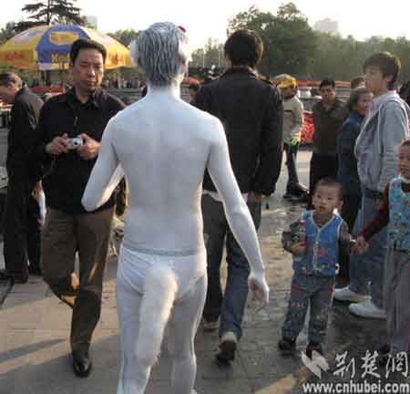 11月9日,武汉首义广场举行菊花展,晴朗的天气给前来观赏菊花的市民带来了方便,市民纷纷拿出自己的相机,用镜头将菊花与自己定格在一种美妙的记忆里。此时一名男子裸身走进菊花展现场,在菊花丛中展示了人体艺术,试图将自身与大自然融合起来。此举引来不少市民围观猜议。市民王先生说:“花展是公共场所,在菊花丛中展示人体艺术,与主题不符,不太妥当。”