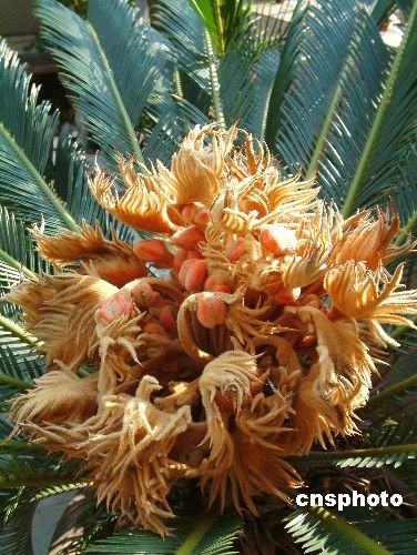 11月10日,江苏海安县粮食局退休干部孙道峰摆放在门口有30余年的一棵铁树开花,花心长出橘红色的果实。据了解,一般铁树要有60至70年的树龄才开花,铁树结果更为少见。中新社发 徐瑞平 摄
