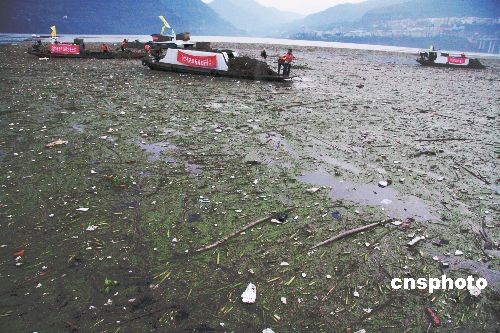 11月10日,重庆市云阳县环卫部门组织的清漂队伍在三峡水库腹心江面紧急打捞。最近一两天来,大量漂浮垃圾涌入完成试验性蓄水任务的三峡水库,在库区湖湾地带汇集形成触目惊心的“垃圾阵”。自三峡工程开展175米蓄水以来,库区水质和航运正常,生态监测情况良好。但由于受前期三峡库区大范围降雨和季风气候影响,库区支流、河叉大量漂浮垃圾涌入三峡水库,在交汇、回水、湖湾等区域集而不散。目前,水库沿线各区县启动紧急应急清漂预案,采取增投力量,人工、机械打捞相结合的办法,全力清漂,确保安全。中新社发 饶国君 摄