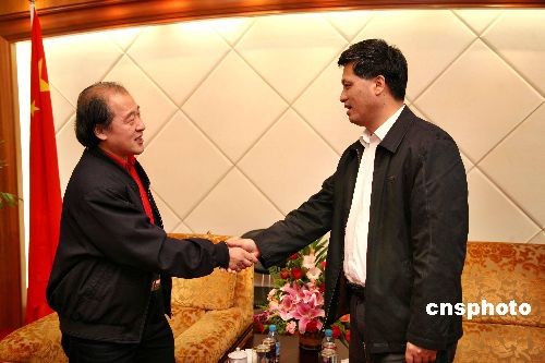 全国政协委员、中国航天科技集团公司党组书记马兴瑞(右)代表全体航天人向画作《腾飞》作者、著名画家王书平教授表示感谢。