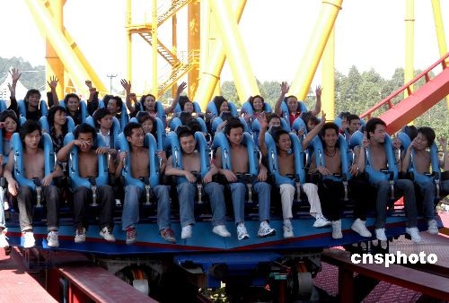 11月11日所谓“光棍节”,对于单身人士来说是一个特别的节日,广州长隆欢乐世界为“男女光棍”举办别开生面的单身派对活动——“脱光勇士”挑战爱情过山车。“脱光”有两层含义,一是把上衣脱光挑战爱情过山车;二是找到心中的伴侣,脱离光棍生涯。中新社发 刘卫勇 摄