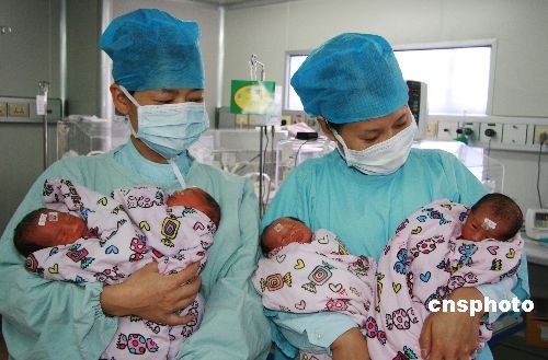 2008年11月12日,四“千金”在苏州附属儿童医院安全度过了24小时。前天下午4点34分到4点38分,来自安徽巢湖的36岁大龄产妇夏玉秀,在苏大附一院通过剖腹产手术产下4名女婴,四胞胎体重分别为1600克、1300克、1600克、1050克。据了解,该大龄产妇是通过人工授精而怀孕的,由于产下的四“千金”身体较弱,随后四“千金”被转到苏州附属儿童医院继续观察治疗,目前母女身体状况良好。 中新社发 朱子寒 摄