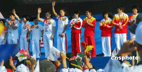 2008年11月16日,第九届中国海南岛欢乐节在文昌市开幕。当日,奥运冠军、著名歌手、神七宇航员等众多各类明星云集文昌,在欢乐节主会场开幕式上亮相,为欢乐节助兴,传递节日的欢乐。中新社发 善平 摄