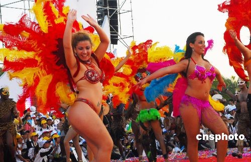 2008年11月16日,在海南省文昌市举行的第九届中国海南岛欢乐节“狂欢大巡游”中,来自巴西的桑巴舞阵,将浓浓的异域风情带到海南。中新社发 善平 摄