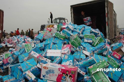 11月17日,河南南阳市卧龙区在生活垃圾处理场集中销毁“三鹿”问题液态奶。当日,该区共销毁从经销商回收和工商机关监督统一下架、集中扣押、封存和消费者退回的问题“三鹿”纯牛奶、酸奶、早餐奶等液态奶16吨,在生活垃圾场采取碾压、深埋,进行无害化处理。中新社发 熊运彬 摄