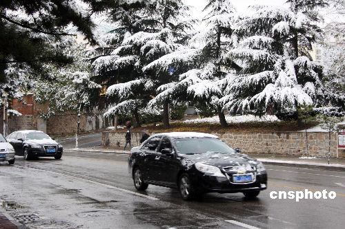 11月18日晨,山东烟台降下入冬以来第一场雪。据当地气象台预报,整个山东半岛中部到北部普降中雪,由于当日气温在2℃~8℃,当人们上班时地面积雪基本融化,未给人们出行带来太大的不便。中新社发 武前才 摄