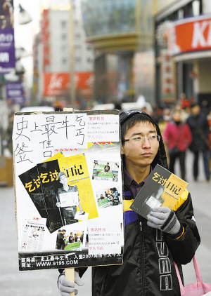 他,今年26岁,曾在高中二年级时因病辍学,之后又因筹钱治病到全国各地乞讨。他的博客点击量超50万、说英文、发名片……11月18日,这个另类乞丐——夏海波走上长春街头,出售以他自己乞讨经历为原型的小说《乞讨日记》。