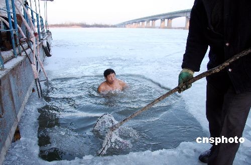 11月20日,哈尔滨公路大桥西侧黑龙江省冬泳协会冰窟池,游泳会长王利敏在冰窟窿里捞冰,准备按计划凿开一个长50米,宽20米的冬泳池。中新社发 姚庭山 摄