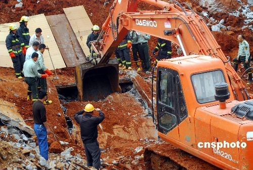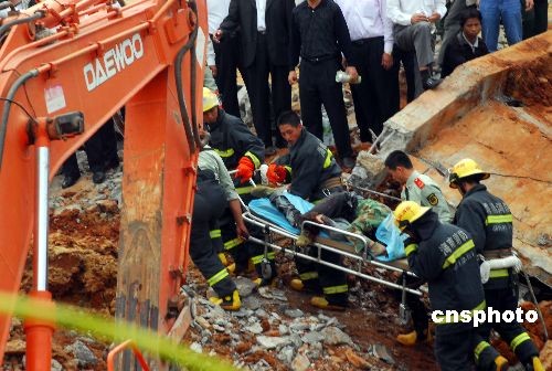 2008年11月20日,海南省澄迈县老城南泰鳄鱼湖公园施工工地发生坍塌事故,两名工人被砸埋进钢筋水泥板下,当场死亡,消防等多部门展开2个多小时救援将死者尸体先后运出。据当地安监部门初步调查,施工单位违章指挥,工人冒险拆运废弃景观瀑布水泥墙的钢筋时,导致约70米长6米高的水泥墙突然整体坍塌,13名在作业的农民工中有两名来不及逃跑而被深埋。目前,有3名相关责任人已被警方控制调查,事故原因和安全责任在进一步调查认定中,善后处理工作也在进行中。中新社发 善平 摄