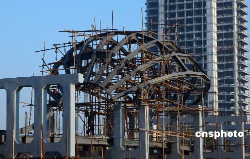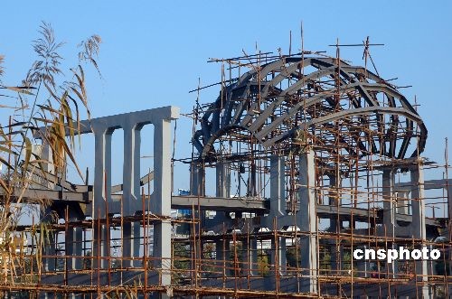 2008年11月21日,几名工人在位于江苏淮安古黄河上的中国南北地理分界标志建筑上施工。由于该工程前期施工时,地球状标志物中间的横梁设计过低,影响行人过往和其他实物的安装,因此,在9月下旬工程施工过半后全部停工。目前工人们正在拆除中间的,主要是地球状标志物下的几根横梁,重新浇铸并提升横梁高度,从而整体抬高地球状标志物。中新社发 贺敬华 摄