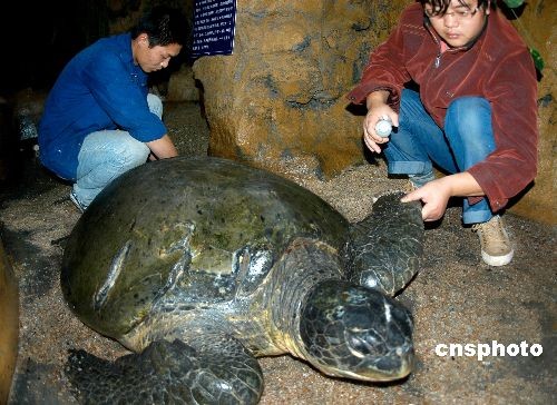 11月22日,绿海龟静静趴在温度适宜的暂养池里,水族馆技术人员用药为它治疗伤口。日前,江苏连云港市连岛水族馆收治了一只巨型绿海龟,经过几日精心救治,这位超过100岁的老寿星会慢慢地将头抬起来。据介绍,这只海龟长约160厘米,宽约100厘米,头部、右前方和左后方龟盖上有明显伤痕,可能是在海水里被螺旋桨划伤的,伸手触摸可以摸到肉,在刚接来时右后腿还在流血,眼睛也受感染。水族馆收治后,派三位专人悉心照料,待伤情恢复后再放归大海。这只巨型绿海龟是赣榆县宋庄镇渔民在收网时无意中捉到的。中新社发 王春 摄