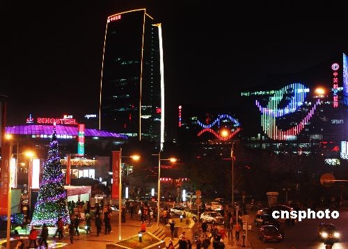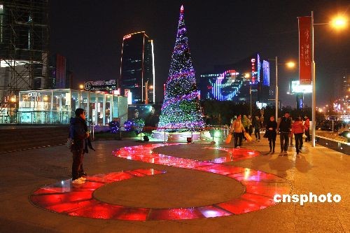 11月23日晚,北京市民在中关村广场感受浓厚的节日气氛。圣诞节前夕,巨型圣诞树打造“流光溢彩”中关e世界,迎接“购物季”的到来,一场圣诞商战正在悄然打响。中新社发 郑雄增 摄