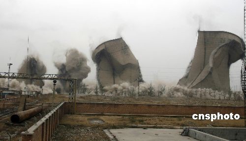 11月23日,华能天津杨柳青热电厂四座发电冷却水塔,被成功爆破拆除。据介绍,四座水塔建设于上世纪70年代,高度为60-90米,是燃油发电机组冷却水的专用设施。图为爆破瞬间。中新社发 段毅刚 摄